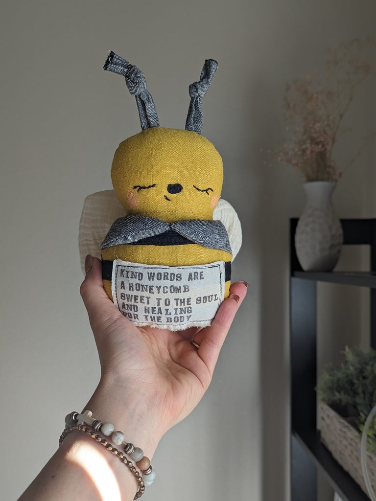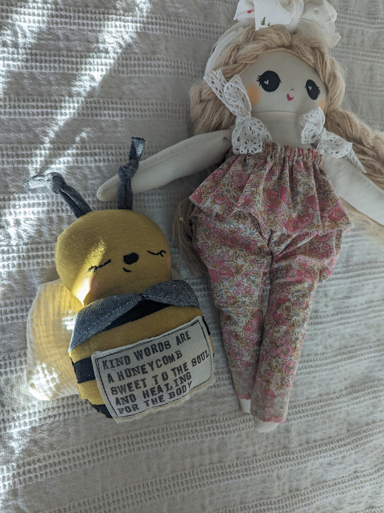 Custom doll remakes - medium dolly with yarn hair + linen bee rattle